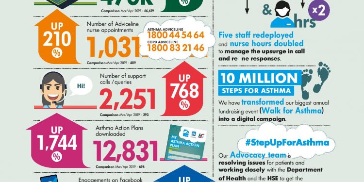 In March and April alone, we fielded 2,251 support calls and queries (up from 293 in the same period in 2019); 1,031 appointments were made with our specialist Asthma and COPD Adviceline nurses (up from 489 in the same period in 2019) and 12,810 Asthma Action Plans – a crucial element of effective asthma self-management – were downloaded from our website (up from 356 in the same period in 2019). Our website visitors have increased 611% to 470,000 over March/April 2020 (up from 66,619 in 2019). We have redeployed five staff, recruited four additional staff members and doubled our nurse hours to field the surge in calls from concerned patients and their carers.