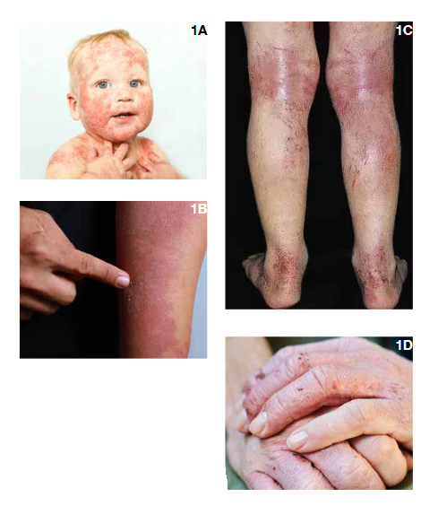 Atopic dermatitis (AD), also known as eczema, is the most common skin condition in children (up to 30% prevalence in the first 2 years of life and 20% overall) and second most common in adolescents and adults (7% prevalence) after acne. AD has a significant impact on quality of life (QOL), and children with severe AD have worse QOL than children with type 1 diabetes mellitus or treatment-resistant epilepsy. The main burdensome symptoms are itch and sleep disruption (Images 1A-1D). AD is associated with other atopic conditions such as food allergy, asthma, and allergic rhinitis. These associations often lead to patients with AD being treated with ineffective and inappropriate treatments, such as dietary restriction, which have no role in AD. AD is also associated with neuropsychiatric disease such as anxiety, depression, and attention- deficit hyperactivity disorder.