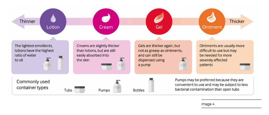 Moisturisers (also known as emollients) should be used twice daily or more, and moisturising after a bath (‘soak and seal’) is an excellent way to hydrate the skin. Moisturisers should be applied downwards to avoid blocking or irritating hair follicles. A pump dispenser is useful for preventing bacterial colonisation of the oisturiser container. Alternatively, a large spoon can be sterilised (using boiling water) and dipped into a tub to avoid transfer of bugs from the parent’s hand to the container (Image 4). Appropriate bathing/showering advice for AD is to avoid soaps or irritant products that produce bubbles, use an emollient (that does not contain sodium laureth sulfate) as a wash, keep the temperature of the bath/shower tepid, and limit the duration of the bath/shower to 10 minutes or less. The skin should be gently patted dry afterwards.