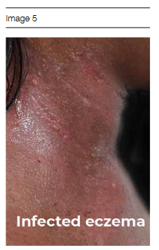 As mentioned, S. Aureus is a significant factor in the pathogenesis and flares of AD. While patients with AD are almost always colonised with S. aureus, some patients will develop bacterial superinfection. This manifests as weeping of clear or purulent fluid, honey-coloured crust, folliculitis, abscess, or cellulitis (Image 5). If there is evidence of bacterial superinfection then oral antibiotics should be prescribed, guided by microbiological cultures (predominantly for resistance information) and local antimicrobial practices. These should be prescribed in conjunction with topical antiseptic measures, which should be instituted as a preventative measure.