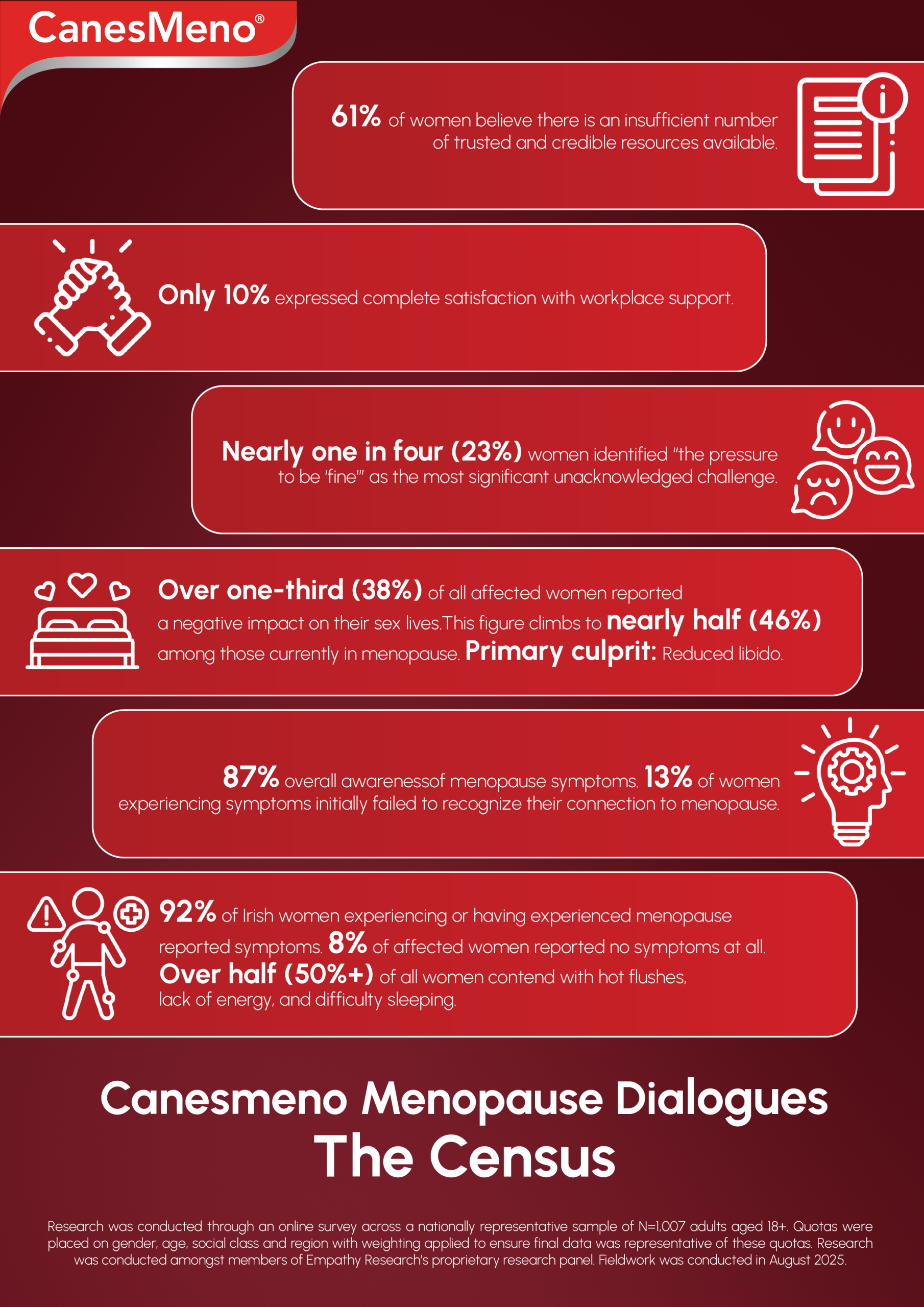 Targeting the estimated one million women in Ireland currently navigating perimenopause or menopause, CanesMeno® aims to empower them to manage their journey with confidence and informed choices. The study, “Menopause Dialogues – The Census,” found that a staggering 92% of women experiencing or having experienced menopause reported symptoms. Despite this prevalence, the research uncovers a critical disconnect in awareness, support, and the societal understanding of menopause’s true impact.