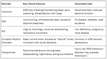 In contrast, obstructive sleep apnoea (OSA) is characterised by loud snoring, nocturnal choking or gasping, and witnessed pauses in breathing during sleep. Patients may complain less about difficulty sleeping and more about feeling excessively sleepy during the day, often falling asleep unintentionally at work, while reading, or even when driving. OSA is strongly associated with obesity and carries significant risks for cardiovascular health, making prompt recognition and referral essential.